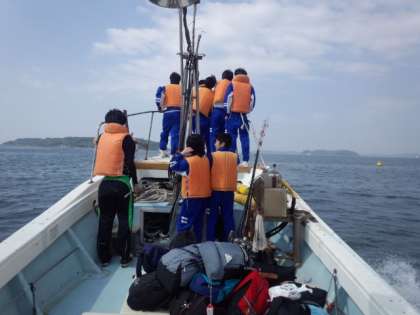 さあ、ここからは目的地である青島には、スリル満点の「海上タクシー」(漁船)で向かいます。5艇に分かれて乗船しました。青島まで 洋上20分ほどの船旅?です。波もなく、穏やかな海上を白波をたてて突き進む船は、エンジン全開。ライフジャケットに身を包んだ生徒たちは、初めてのタクシー?経験に、潮風をあびながら、歓声をあげ大興奮でした。