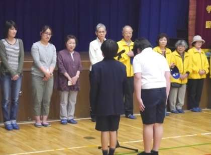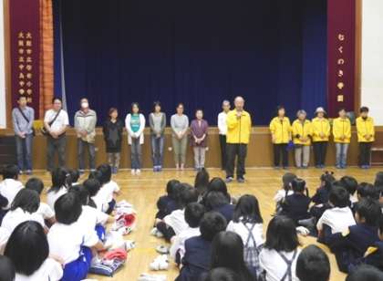 5月23日(金)、児童朝会で「むくのきキャッチ活動」のボランティアの方々と顔合わせを行いました。『むくのき学園』では、保護者・地域の方々を対象にボランティアを募集し、登校時の見守り(セーフティ)や清掃活動(クリーン)、学校緑化(グリーン)、学校図書館ボランティアなどにかかわっていただいています。