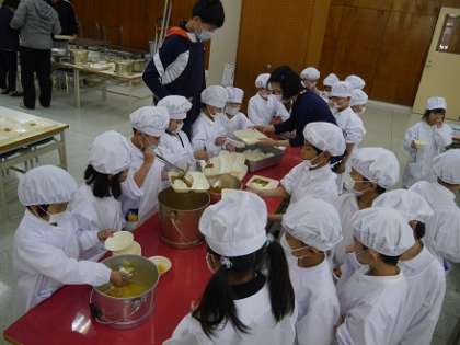 1年生にとっては初めての給食です。先生のやさしいリードにしたがって、配膳など手際よく準備ができました。新しい仲間と笑顔いっぱいに、おなかいっぱい食べました。今日は「入学祝い献立」のカツカレーライス、フルーツ白玉、牛乳です。やはりカレーは子どもたちに大人気で、すぐにおかわりの行列ができました。