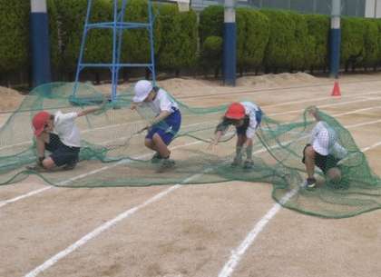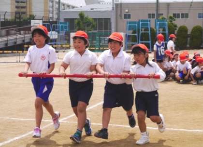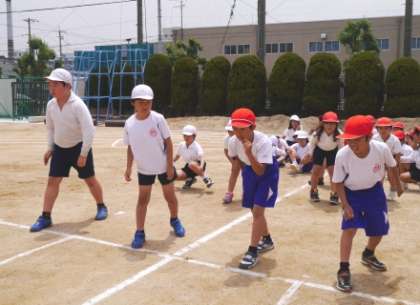 6月3日(火)3限、3年生、4年生では運動会の「それぞれの種目練習」をしました。まず、全体で紅白に分かれて行ったのが「台風の目」【写真左】。一本の棒を4人で持ち、時計回りや反対回りをした後、待機しているチームのなかまを棒の下からや上からとおして、次々にリレーしていきました。コーンを回るスピード感が難しかったようです。