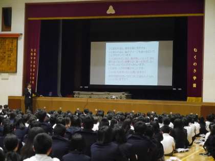 いじめは、相手にふと「嫌なこと」を言ってしまうことから始まります、と静かにお話が始まりました。そして体育館スクリーンいっぱいに絵本やスライドを投影しながら、松谷みよ子さんの「わたしのいもうと」の読み聞かせをしてくださいました。1年生から9年生まで全員が校長先生の言葉を真剣に聴き入り、情景をイメージしている様子 でした。