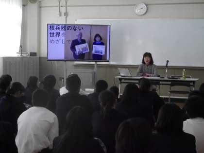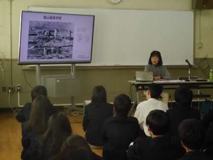 午後、9年生では「平和学習」 として、原爆被爆者の体験を引き継いだ次世代の証言者を長崎からお招きし、交流証言講話 をお聴きしました。