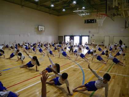 体育館では5・6年生が、音楽に合わせ団体演技「組体操」の練習に励んでいました。まだ演技の最初の部分ですが、指先、つま先まで神経を張りつめているようすでした。運動会の本番が楽しみです。