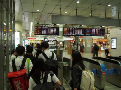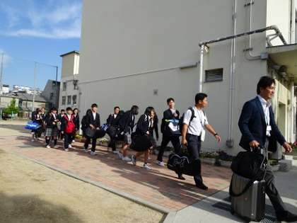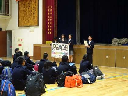 出発式では、校長先生のあいさつに続いて修学旅行実行委員の代表生徒から修学旅行のスローガン「PEACE〜平和も笑顔も築け68期生〜」との呼びかけがありました。いよいよ長崎に出発です。