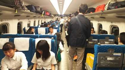 新幹線の車内ではマナーを守りつつ、リラックスしています。すでに徳山を通過しました。おやつやゲームを楽しみ、みんな笑顔です。これからの学習に備え、早めの昼食をとり下車に備える予定です。