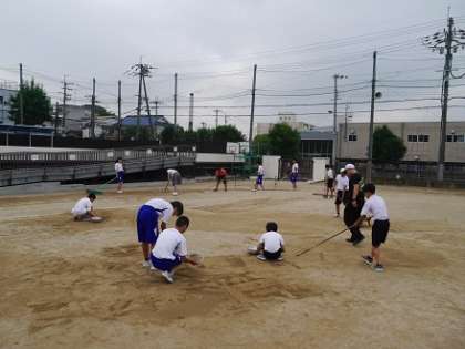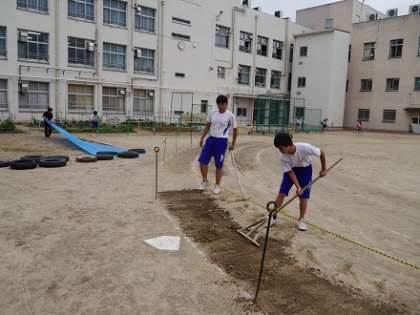午後、むくのき学園児童生徒、全教職員で、運動会会場設営準備 を行いました。今週は強い雨が降り、運動場が緩んでいるため、皆さん丁寧にコースを整えてくれていました。みるみるうちに、運動場から小石もなくなり、コースもきれいになりました。転んでも大けがをしない、安全な運動場 に戻りました。