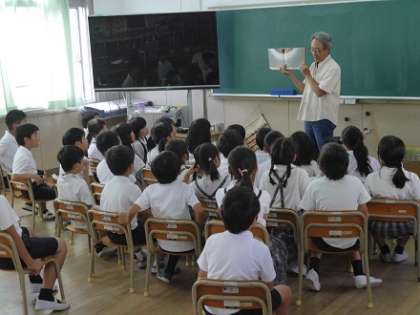 「わくわく本読み隊」は、1年生から7年生まで、隔週で水曜日に実施しています。子どもたちは教室の前の方に集まり、身を乗り出して目をキラキラと輝かせて、静かに聴き入っていました。絵本による読み聞かせによって、情景を頭の中で思い描くことは、感性豊かな想像力や表現力、読解力につながっていく と思います。