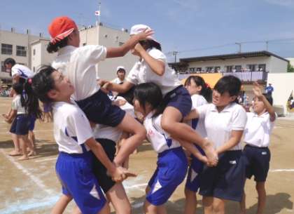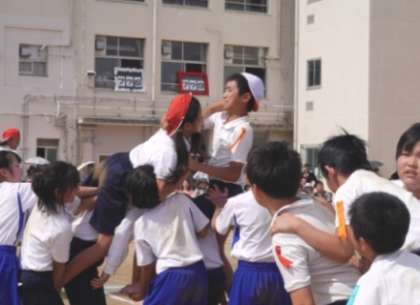 5・6年生最後の団体競技は、恒例の「騎馬戦」でした。全騎馬が渡り合う総力戦と、1騎ずつが向き合う対戦方式で勝負を競いました。体をのけぞりながら敵をかわしたり、手を組みあったすきにすばやく帽子に手を伸ばしたりと、見ている人たちも手に汗握る攻防でした。