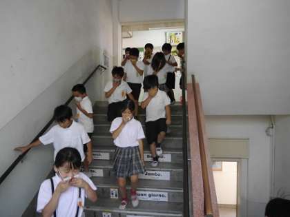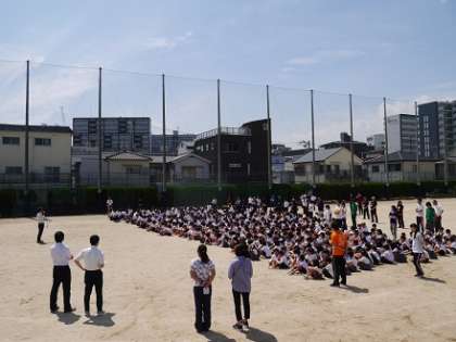 サイレンの音に、低学年児童は今にも泣きだしそうな表情で、しっかりハンカチを口に当てていました。全学年児童生徒は、先生の先導のもと、運動場にすばやく集まりました。