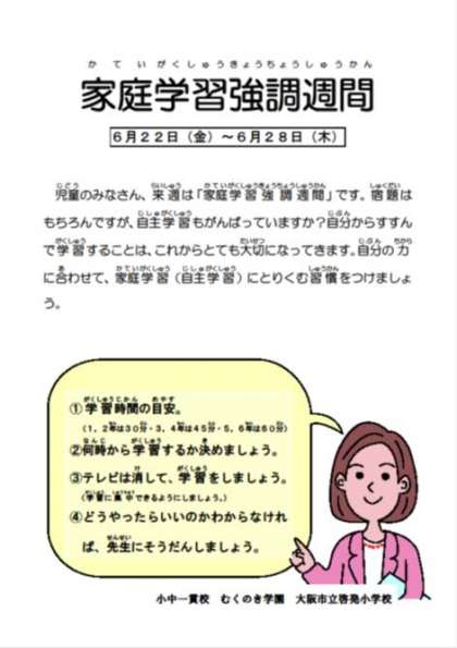 小学校では、6月22日(金)〜6月28日(木)の期末テスト前日までを「家庭学習強調週間」としています。家庭で学習する習慣をつけることはとても大切です。宿題はもちろんのこと、自分で復習することを見つけ、すすんで勉強するようにしましょう。学習時間は、学年があがるにつれて、目標設定時間を伸ばしていくようにしましょう。
