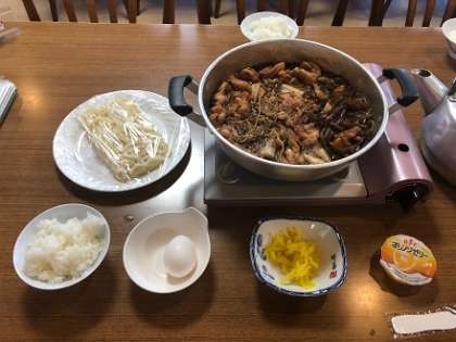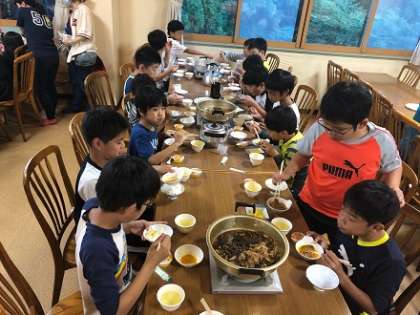 お風呂で汗を流したあとは、お楽しみの夕食 の時間です。みんな、お腹はぺこぺこです。メニューは とりすき焼き、ゼリー、うどん でした。美味しかった〜!