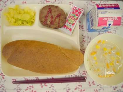 今日の献立は、「焼きハンバーグ、キャベツのカレーソテー、豆乳コーンスープ、牛乳」 です。みんなハンバーグは大好物です。中学生も教室で楽しく談笑しながら、給食の時間を楽しんでいました。明日もみんなが大好物のカレーライスです。8月は食物アレルギーサポート月間 で、明日のチキンカレーライスに使用するカレールウは、小麦粉を使用せず米粉を原材料としています。お楽しみに。