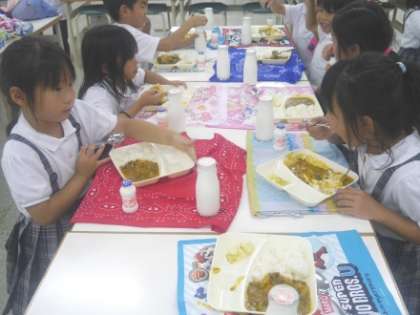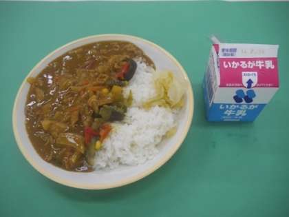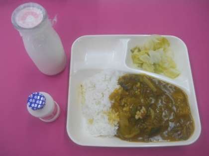 つけ合わせは、小学校がキャベツのサラダとはっ酵乳、中学校はキャベツのピクルスとアンデスメロンでした。今日は偶然にも小中学校とも夏バテ予防のカレーライスが、食をそそらせてくれました。