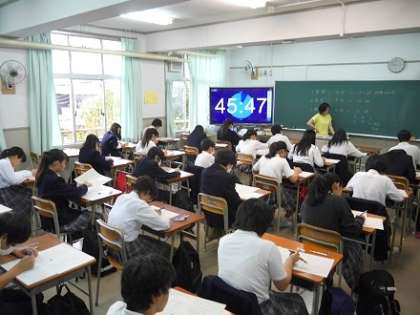 生徒たちは、テストが始まるまでノートや教科書を見返すなど、集中力を高めているようすでした。特に、英語のリスニングテストが始まると、静寂の中、みんな真剣に放送を聴き入り、問題に取り組んでいました。
