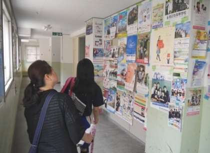 7月14日(月)午後、今週も全学年で学期末懇談会が続いています。9年生の教室がある1号館では、生徒のみなさんが懇談に来られた保護者の方と一緒に、進路関係のポスターに目を向ける光景【写真左・中】が見受けられます。