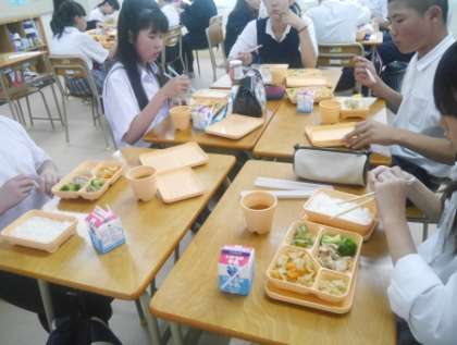 中学校給食の食物アレルギー対応については、これまで牛乳提供中止・給食の自己除去・弁当持参のいずれかでしたが、2学期の給食から、個別対応ができるようになりました。主食(ごはん)を月単位で停止、副食(おかず)を日単位で停止できます。個別対応を希望される場合は、毎月、前月の10日まで(8・9月分は7月31日まで)に申請書を学校に提出してください。詳しくは、本日配付の「食物アレルギー個別対応について」をご覧ください。【写真は、7年生の給食の様子です。】