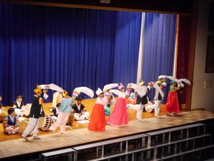 ■ヘバラギキョシル/チョソン子ども会の発表は、サムルノリ・タルチュムなど の演奏です。拍手喝采。つづいて美しくきらびやかな民族衣装による舞いです。鮮やかな色彩と優しく美しい衣の動きに見とれます。大いにみなさんを楽しませる発表となりました。