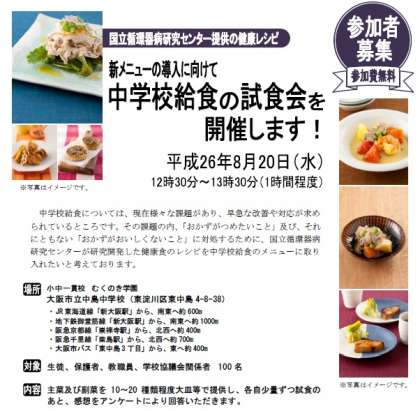 来る8月20日(水)に、教育委員会・東淀川区役所主催で「中学校給食の試食会」が開催されます。新メニューの導入に向けて、国立循環器病研究センターが研究開発した健康食のレシピを中学校給食に取り入れるための試食会です。