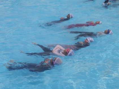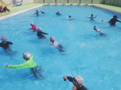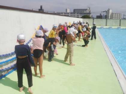 「服をきてプールの中を歩く」「服を着て背浮きをする」「長い時間浮くために空きペットボトルを抱く」など、様々な練習の中で「着衣泳」の難しさを感じていたようです。なお、プールの水は、毎週金曜日が清掃・換水日となっています。