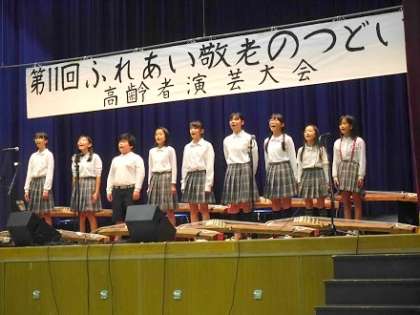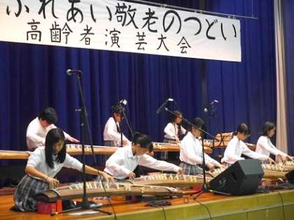 10月27日(土)、昨夜から続いた雨は止み、秋晴れのさわやかな天気となりました。午後から啓発地域「ふれあい敬老のつどい」(高齢者演芸大会)がむくのき学園体育館で開催され、「音楽部」が箏の演奏、合唱を行いました。9年生が先日の文化祭で引退しましたが、8年生が中心となりせいいっぱい頑張りました。箏の美しい音色による演奏と、美しいハーモニーにおおきな拍手をいただきました。