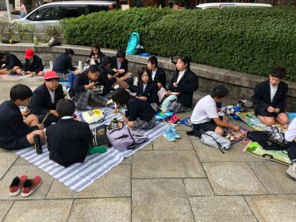 午後、平和記念公園そばの宿舎に大きな荷物を預けて公園内へ。各自で用意をしてきたお弁当 をいただいた後、原爆ドームをバックに集合写真 を撮りました。目の前に迫る原爆ドームの悲しき姿からは、73年前の惨状を今に伝える無言の迫力が感じられました。
