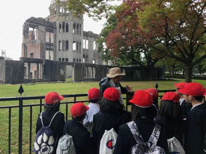 公園内を二つの班に分かれ、ガイドによる平和記念公園めぐり 。平和記念資料館を出発し、「被爆したアオギリ」「原爆の子の像」「平和の鐘」などを巡りました。