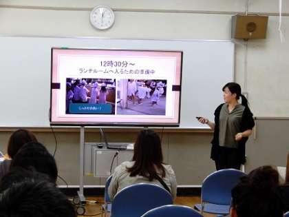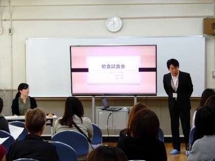 まず視聴覚室で、副校長先生から大阪市の給食の現状、担当栄養教諭から大型モニターを使って、日頃の給食のようす についての説明がありました。その後、児童たちと一緒に給食を試食していただきました。献立は、「鶏肉のごまだれ焼き、ソーキ汁、もやしのしょうがじょうゆあえ、ごはん、牛乳」 でした。
