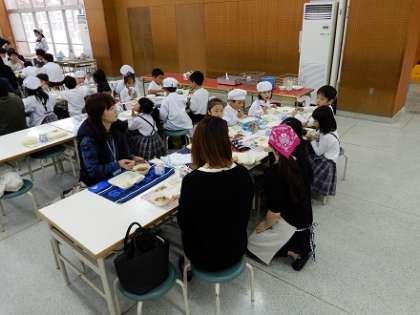 子どもたちは、お母さんやお父さん、おばあちゃんのランチルーム登場に大喜びのようすでした。参加者の皆さんには、子どもたちの配膳の様子や、楽しい給食の様子も見ていただき、内容の濃い試食会となりました。