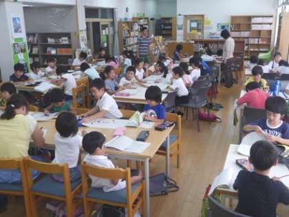 7月22日(火)午前、1年生から6年生では、今週は 「パワーアップスタディ」 を開催しています。1学期の復習や夏休みの宿題など、それぞれの課題に応じて学習に取組んでいます。小学生では、全体の約7割の児童が通常どおりに登校し、各教室で担任や学年の教員とともに、学習をしていました。夏季休業中は教室の空調機(エアコン)改修工事のため、1・2年生は図書室、3・4年生は視聴覚室、5・6年生は理科室・家庭科室で学習しています。