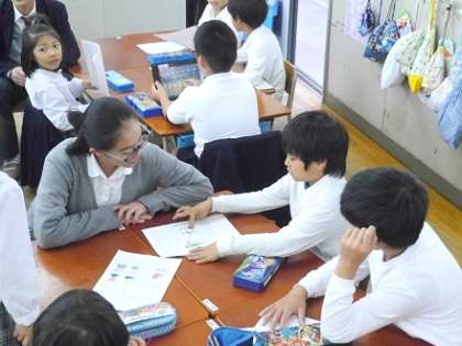 今日は、「教育学」という選択教科を学んでいる高校生が、2年生の授業で学習補助の体験研修をおこないました。はじめは緊張感で高校生・小学生ともかたさが感じられましたが、やさしく教えてくれる高校生のお兄さん・お姉さんに、すぐに小学生のみなさんも、アドバイスを求めるようになりました。