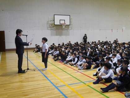 11月16日(金)、今日は青空が美しい晴れの天気となりましたが、放射冷却の影響でとても肌寒い朝となりました。体育館では、1〜6年生の児童朝会がありました。
