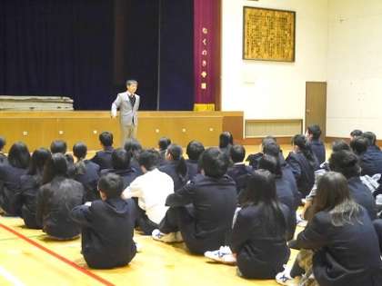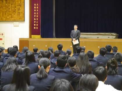 体育館では7年生から9年生の生徒集会があり、校長先生の講話の後、東淀川警察署の現役の警察官の方から薬物乱用防止についてお話がありました。薬物の種類や依存に至る過程、幻覚症状や依存性により脳をはじめとする身体に重篤な影響を及ぼす等、本当の恐ろしさについて、わかりやすく教えていただきました。