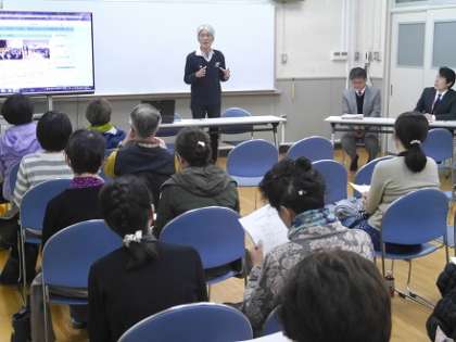学習会では、まず副校長から「むくのき学園の取組・特色」を学校パンフレットとともにご説明させていただき、学校長からは大型モニターを用いて、これまでの全市募集の状況や、文化祭など動画で子どもたちのようすをお伝えさせていただきました。その後、啓発地域活動協議会子育て教育部長より「地域の学習支援のとりくみ」について、これまでの経緯や現状について、くわしくご説明いただき、取組の成果や課題を認識・共有できた、有意義な学習会となりました。