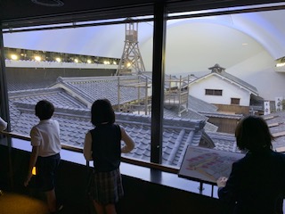 館内で児童たちは、江戸時代へタイムスリップした「なにわの町家」 を探訪し、当時、天下の台所として賑わいを見せていた大坂の町並みを散策しました。さらに、8階では、明治から昭和に至る町の表情や、暮らしぶりを模型で再現したミュージアム、「モダン大阪パノラマ遊覧」を見学しました。