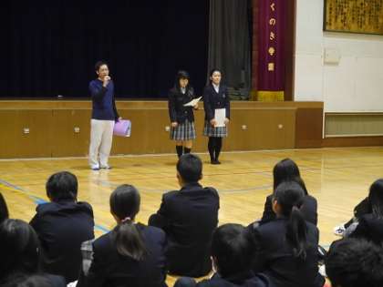 また、7〜9年生の生徒たち全員が感謝の気持ちを込めて、給食調理員さんへメッセージカードを書き、クラスごとに手渡しました。調理員さんの代表の方が笑顔で受け取られ、中学生の皆さんに感謝の気持ちを述べられました。調理員のみなさん、毎日美味しい給食を作っていただき、本当にありがとうございます。