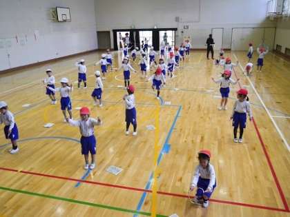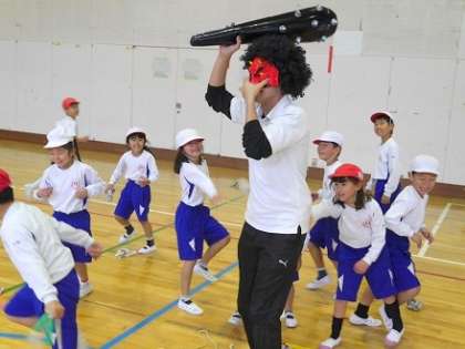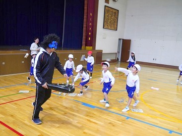鬼の登場に、最初は怖がって逃げ回っている児童もいましたが、鬼が先生とわかると大喜びし、笑顔で「新聞紙で作った豆」をぶつけていました。鬼たちも、1年生の動きに合わせながら、逃げたり追いかけたりし、子どもたちにとって大はしゃぎで走り回る楽しい体育の授業となりました。