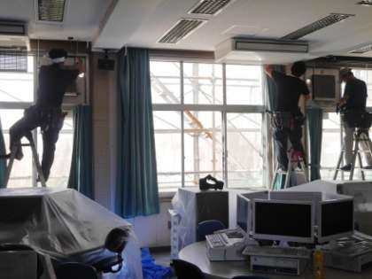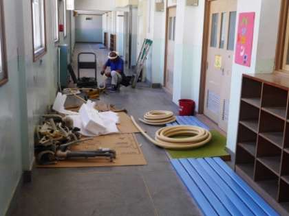 さて、職員室や保健室をはじめ、2号館や4号館の1年生から6年生が使用する教室や学習室では、この夏休み期間に空調設備(エアコン設置)の新調入れ替え工事が、順調に進んでいます。始業式には間に合うように、暑い中作業を進めていただいています。