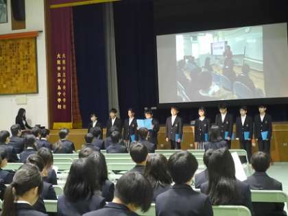 2月14日(木)、今日は気温が一気に下がり、寒い一日となりました。午後1時30分から、7年生は体育館で「志学式」を実施しました。生徒たちはこの志学式に向け、「わたしたちが拓く未来 〜わたしたちが めざす社会〜」をメインテーマに、自らが選択したテーマに沿って、グループごとで学び合い、議論してきました。そして今日、新たな学びの志を確かなものとする発表を行いました。