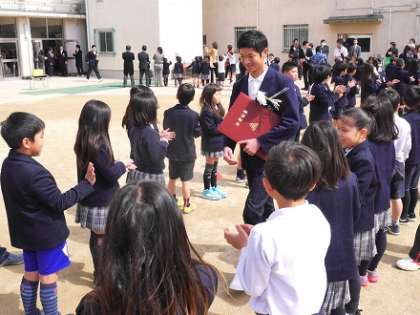 閉式後、むくのき学園ならではの、小学1年生から8年生までの児童・生徒による長い長い花道を鳴り止まない拍手で卒業生を見送りました。