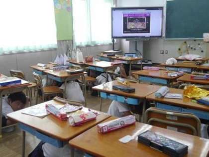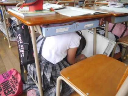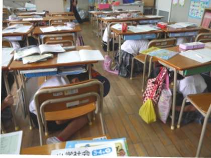 訓練放送が流れると、3・4年生の各教室では児童たちが、教員の指示で授業を一時中断し、机の下にからだを隠し、机の脚をしっかり持って身の安全を図っていました。児童生徒たちも、万が一に備えて、防災について考える機会となりました。【写真左は3年1組、写真中・右は4年1組の教室での様子です。】