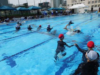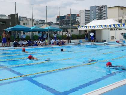 自由形、平泳ぎ、メドレーリレーなどの競泳種目と、碁石拾い、水球などの団体種目に分かれて参加し、学級別に競います。