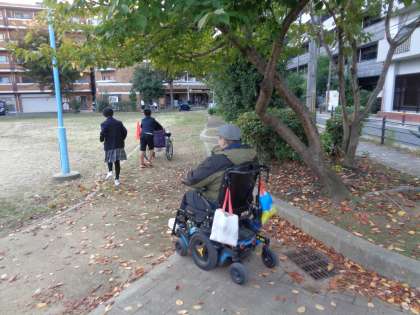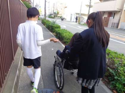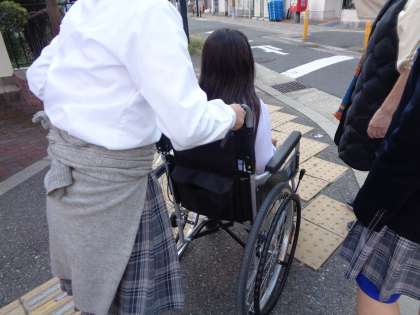 お招きして、一緒に学校周辺の道路や公園を車いすで移動し、