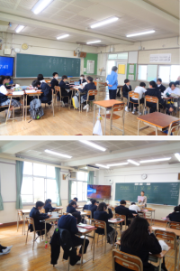 写真は1枚目から順に4年1組、5年生(合同)、6年1組、6年2組の授業の様子です。