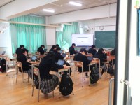 9年生の学年フロアに、修学旅行先の長崎についてまとめられた資料が掲示されていました。事前学習として各班で調べた、長崎の名所や食べ物、歴史や自然などについてイラストや写真を用いてわかりやすくまとめられていました。