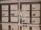 ランチルームのガラス越しに、1年生から6年生までの宿題が掲示されています。家族...