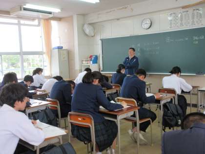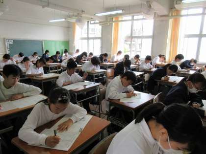 中間テスト2日目です。写真は1時間目、理科のテストを受ける1年生と3年生の様子です。真剣な顔つきで問題に取り組んでいました。