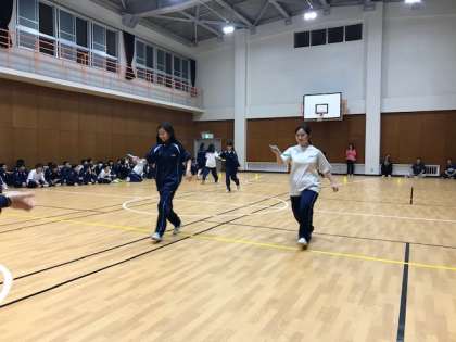 夜の活動、体育館での 室内オリンピックの様子です。 お玉リレーをやっています。