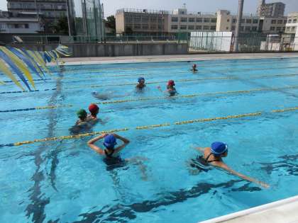 ソフトボール部:合同練習から帰ってきた後、プールでクールダウン。のはずが、水温まさかの30度越え!でも3学年仲良く水中鬼ごっこを楽しんでいます。