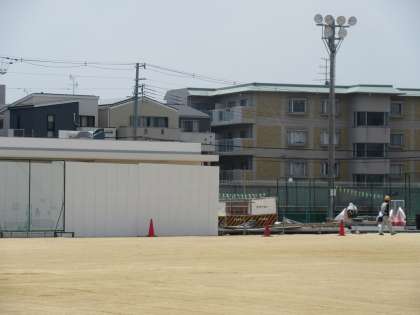 ようやく運動場の高い壁が撤去され、給食棟の全容が明らかになってくるところです。新しい渡り廊下も完成間近です。本日、給食棟のカギの受け渡しも行われ、2学期からの給食に向けて着々と進行中です。