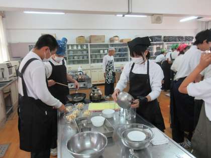 2年生が調理実習でキャラメルコーンを作っています。焦がさずにうまくカラメルをなじませて、おいしくいただくことができました。